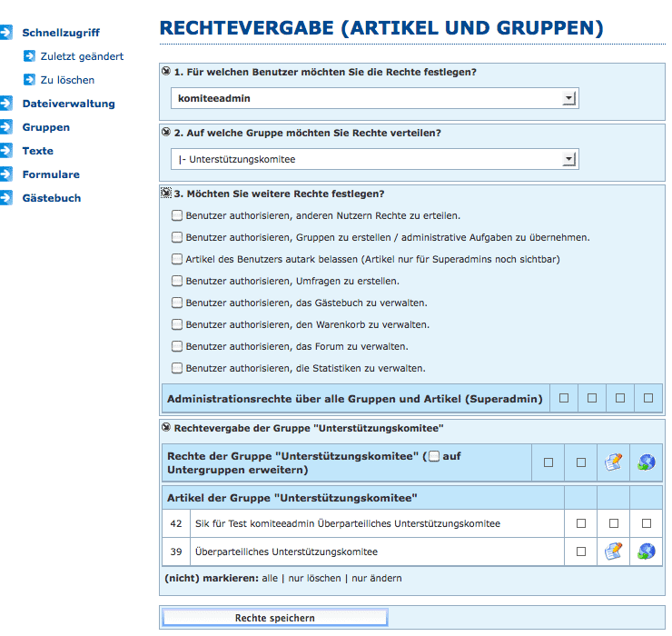 Solltest Du also das Recht für einen Artikel in der Gruppe von der Ebene 2 vergeben, musst Du der Gruppe von Ebene 1 und Ebene 0 oben erwähntes Recht zuweisen.
