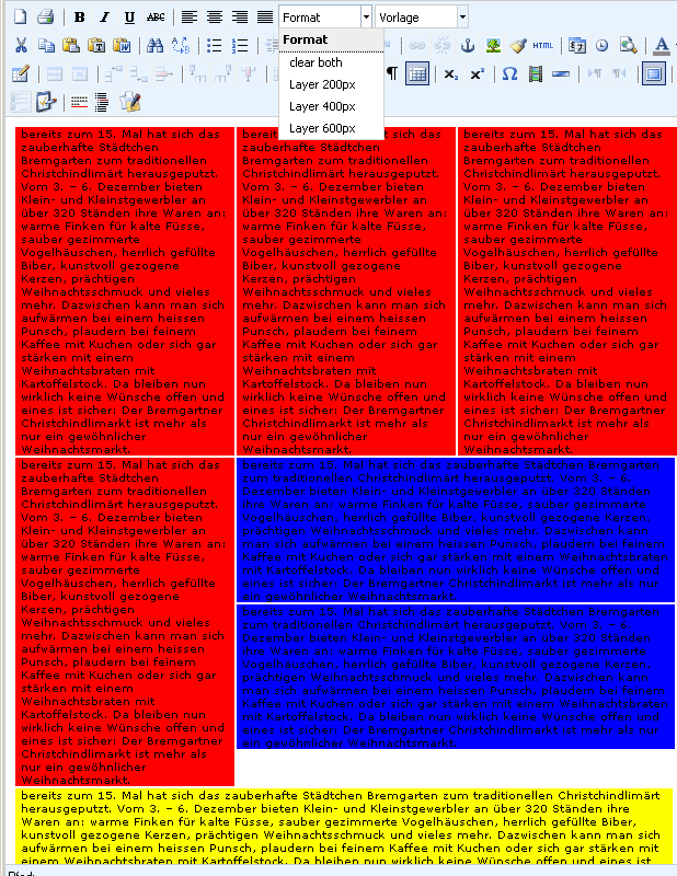 Ein Artikel mit mehreren DIVs mit Platzierung über CSS-Klassen. DIV\'s können in TinyMCE (DynPG 4.0.0) erstellt und von der absoluten in die relative Positionierung versetzt werden. Anschliessend kann über Format den DIV\'s die Klasse zugewiesen werden. Siehe Anhang.
